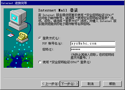 此处填写的是在Outlook express 中您的英文或者拼音名字。它并不影响您的任何工作,只是在您有多个邮箱时可以用来标识是哪个信箱。至此,您已经简单的设置完您的一个信箱。再进行简单的几步设置,就可以开始使用信箱了。